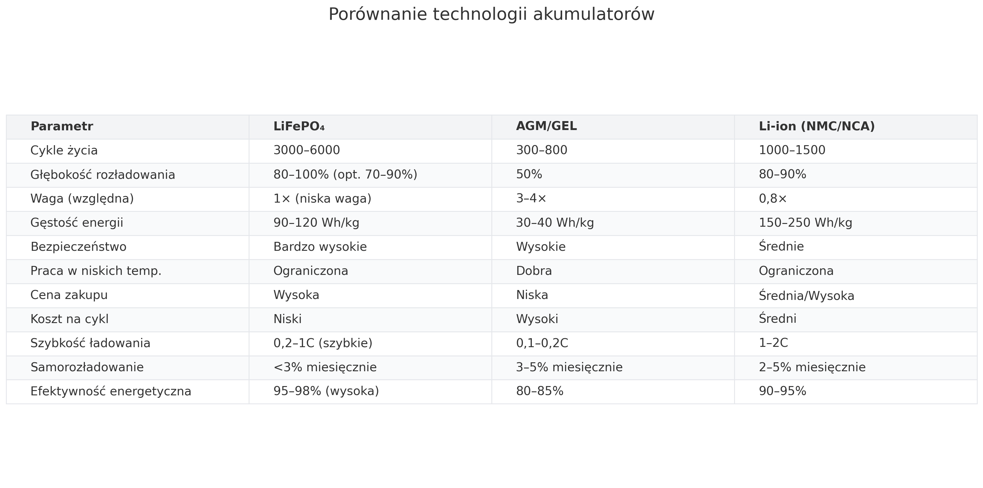 Ta tabela jasno pokazuje, że każda technologia ma swoje mocne strony. Akumulatory LiFePO4 wygrywają w zakresie żywotności, bezpieczeństwa i możliwości głębokiego rozładowania, co czyni je idealnym wyborem do długoterminowych instalacji fotowoltaicznych, systemów off-grid i zastosowań w pojazdach rekreacyjnych.